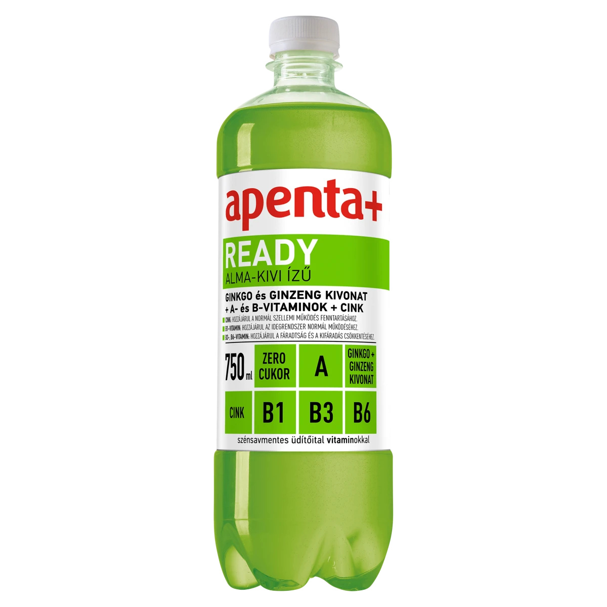 Apenta Mineral természetes ásványvíz,Étkezési sav (citromsav),Tartósítószer (kálium-szorbát),Ginkgo kivonat (20 mg/100 ml),Ginzeng kivonat (20 mg/100 ml),Stabilizátorok (gumiarábikum, fagyanta glicerin-észterei),Aromák,Édesítőszerek (ciklamátok, aceszulfám K, szukralóz),Vitaminok (niacin ((B3-vitamin) nikotinamid), B6-vitamin (piridoxin-hidroklorid), tiamin ((B1-vitamin) tiamin-mononitrát), A-vitamin (retinil-acetát)),Színezékek (klorofillok és klorofillinek rézkomplexei, karotinok),Antioxidáns (aszkorbinsav),Cink-acetátTápanyagok