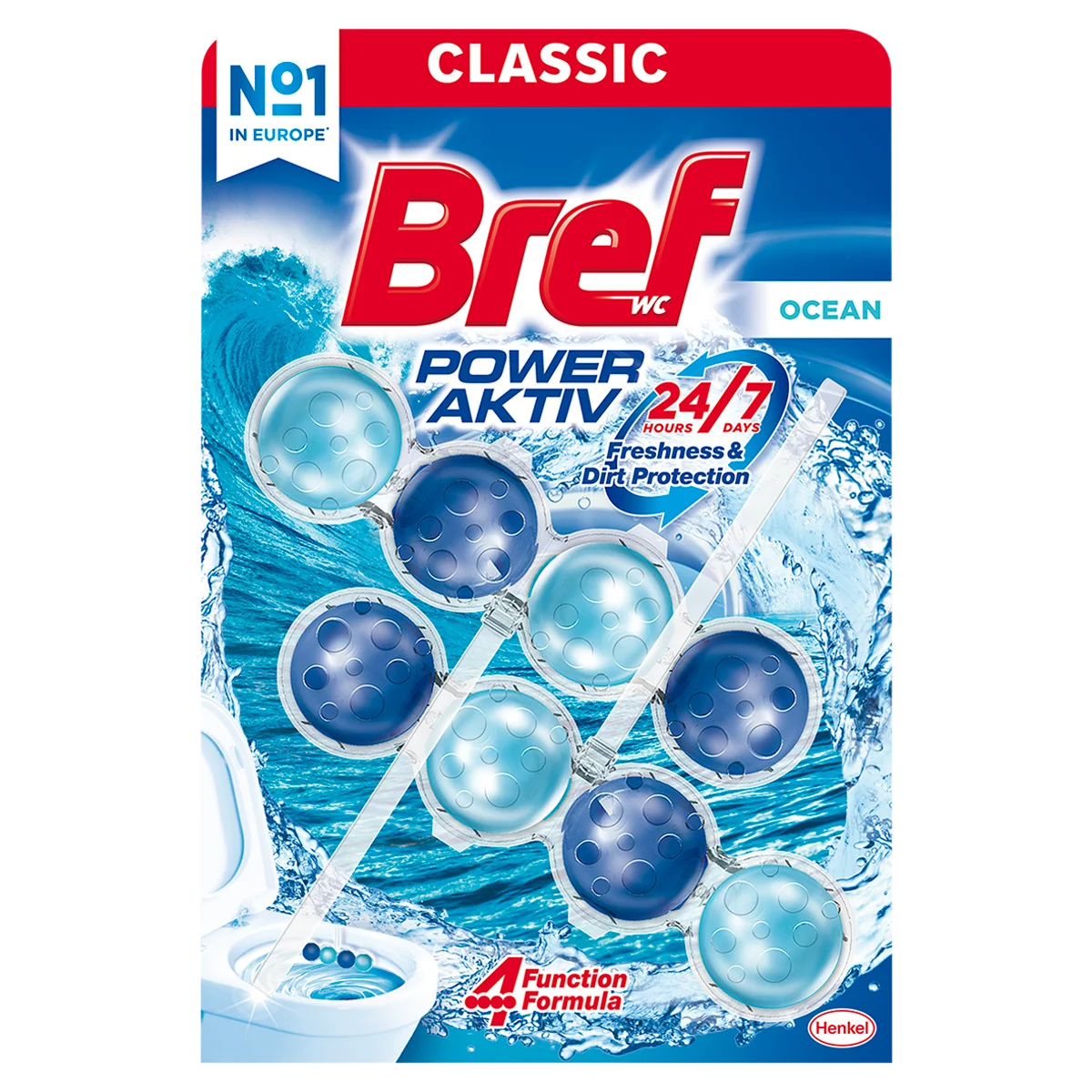 A Bref Power Aktiv Ocean nemcsak tisztán tartja a toalettet minden öblítéssel, hanem 24 órás frisseséget és szennyeződések elleni védelmet is biztosít az öblítések között a hét minden napján. 4 funkciós formula: 1) Tisztító Hab 2) Vízkő elleni hatás 3) Szennyeződés elleni védelem 4) Extra frissesség Újrahasznosításhoz kérjük válassza külön a kartont a műanyagtól.