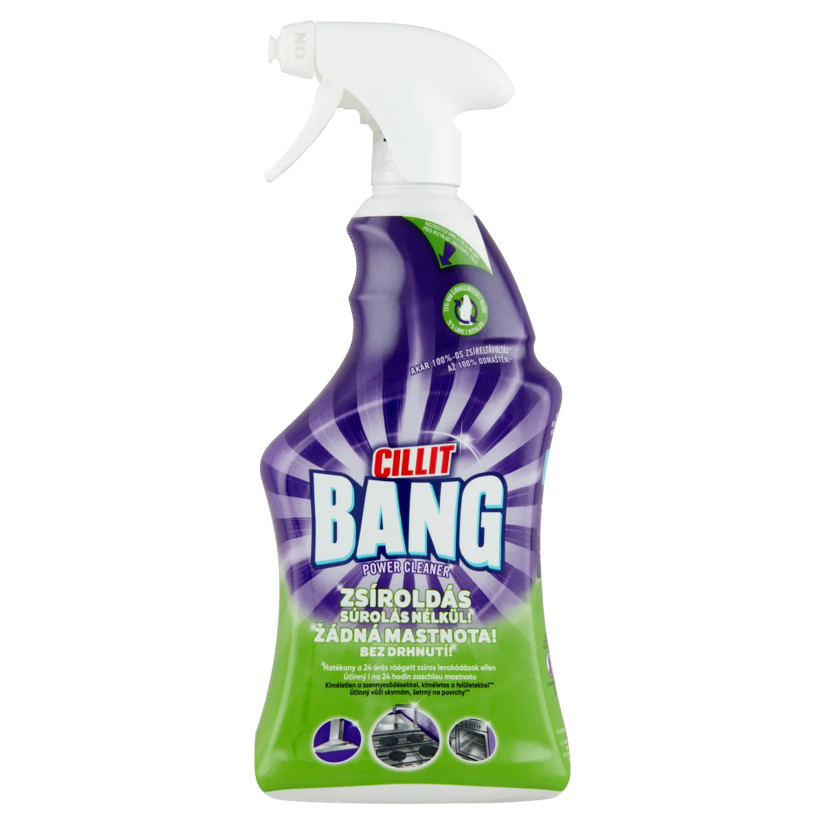 Cillit Bang Expert Zsíroldó Spray (háztartási felületek tisztító zsíroldó hatású fertőtlenítése, felhasználásra kész folyadék) Akár 100%-os zsíreltávolítás* Eltávolítja a baktériumok, egyes gombák és vírusok 99,9%-át.* Kíméletlen a szennyeződésekkel, kíméletes a felületekkel** *Az elvégzett tesztek alapján **A használat nem ajánlott az alábbi felületeken: Fa, linóleum, textil, maratott/matt üveg, sárgaréz, vörösréz, gránit. Ha ezekkel a felületekkel érintkezik, azonnal öblítse le vízzel. Fémekkel, régi porcelánnal, laminált műanyaggal való tartós érintkezés elszíneződést okozhat. Használat előtt mindig tesztelje egy nem feltűnő, kis részen, hogy megbizonyosodhasson róla, az anyag nem károsítja a felületet. Hatékony fertőtlenítőszer Benzalkónium-klorid Elpusztítja a baktériumok és vírusok 99,9%-át