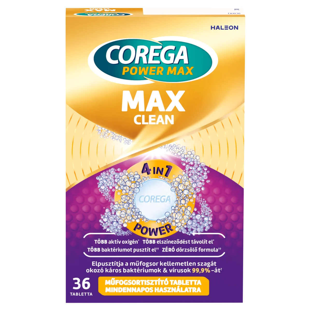 Használati utasítás mindennapos használathoz: 1. Dobjon egy Corega Max Clean tablettát egy elegendő mennyiségű meleg, de nem forró vizet tartalmazó műfogsortartó dobozba vagy pohárba úgy, hogy a víz ellepje a teljes/részleges műfogsort. 2. Helyezze bele a műfogsort az oldatba és áztassa 3-5 percig. A legjobb eredmény érdekében a tisztítóoldat és egy puha kefe segítségével is tisztítsa meg a műfogsort. A tisztítást követően azonnal öntse ki a megmaradt oldatot. 3. Ezután folyóvíz alatt alaposan öblítse le a műfogsort. Teljes és részleges műfogsor tisztításához is használható.