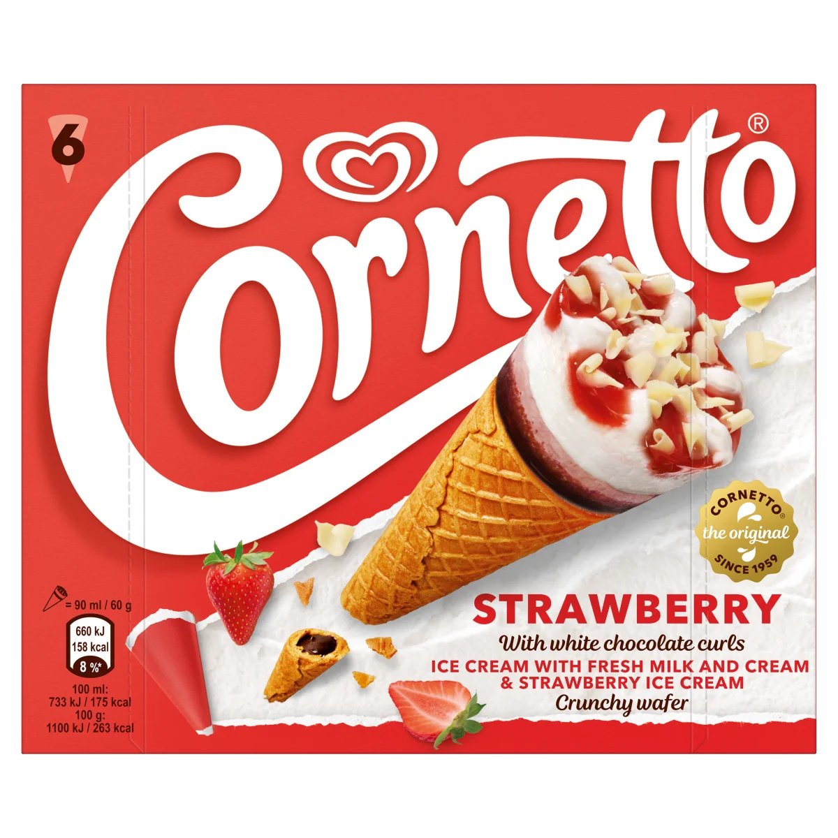 Epres jégkrém és vanília ízű tejjégkrém (5% tejszínnel) epres szósszal (6%), ostyatölcsérben (15%), kakaós bevonóval (7,5%) és fehér csokoládé darabkákkal (2,5%).