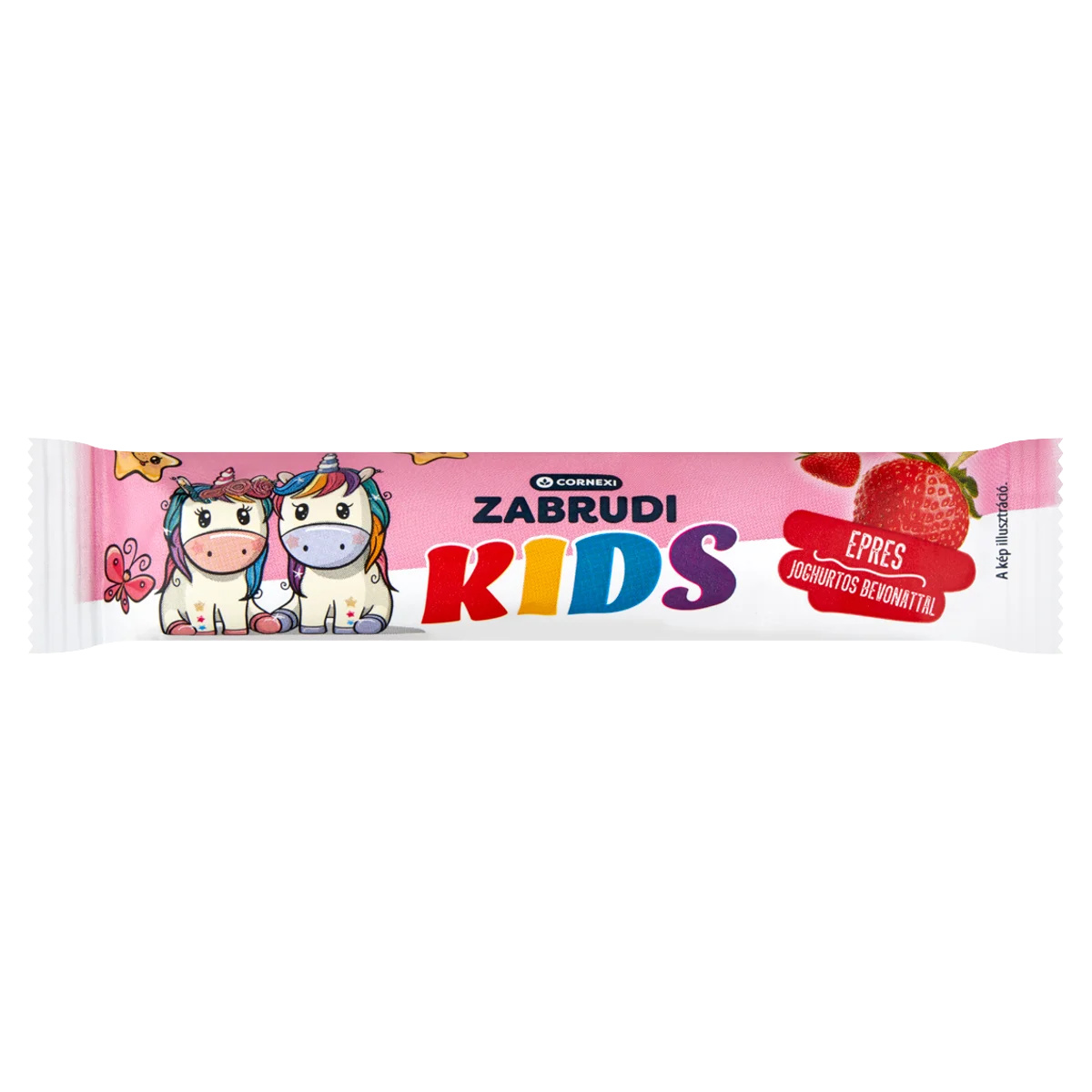 Vaníliaízű, epres töltelékkel töltött zabrúd joghurtos bevonattal.