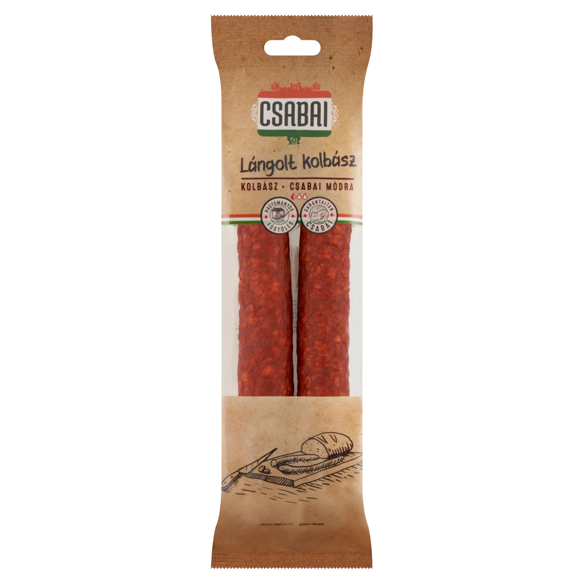 Érlelés-szabályozóval készült füstölt kolbász, védőgázas csomagolásban.