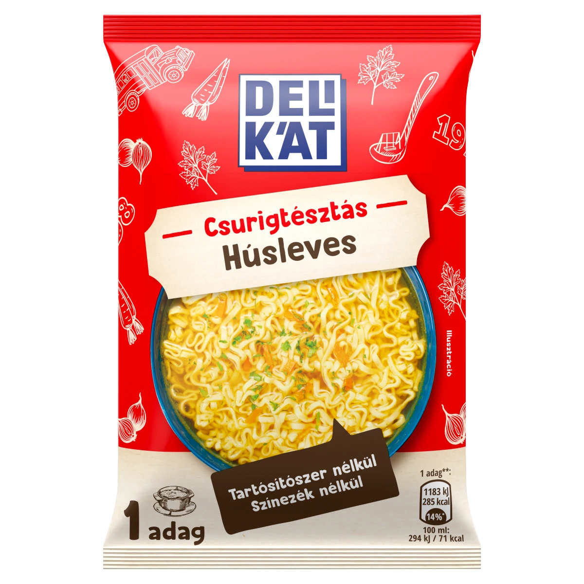 Tészta (88%): búzaliszt, napraforgóolaj, módosított keményítő, só, cukor, repceolaj, kurkumakivonat,Ízesítőpor (12%): jódozott só (só, kálium-jodát), aromakészítmény [aromák, ízfokozók (nátrium-glutamát, dinátrium-inozinát, dinátrium-guanilát)], sóhelyettesítő (kálium-klorid), ízfokozók (nátrium-glutamát, dinátrium-inozinát, dinátrium-guanilát), keményítő, cukor, 6,2% sárgarépa¹, fűszerek (kurkuma, petrezselyemgyökér¹, lestyángyökér¹, zellermag), 2% tyúkhúspor [tyúkhús, só, antioxidáns (rozmaringkivonatok)], 1,7% petrezselyem¹, vöröshagymapor¹, póréhagyma, étkezési sav (citromsav), pálmazsír, tyúkzsír [tyúkzsír, antioxidáns (rozmaringkivonatok)], karamellszirup, maltodextrin,A %-ok az ízesítőporra vonatkoznak,¹Fenntartható gazdaságbólTápanyagok