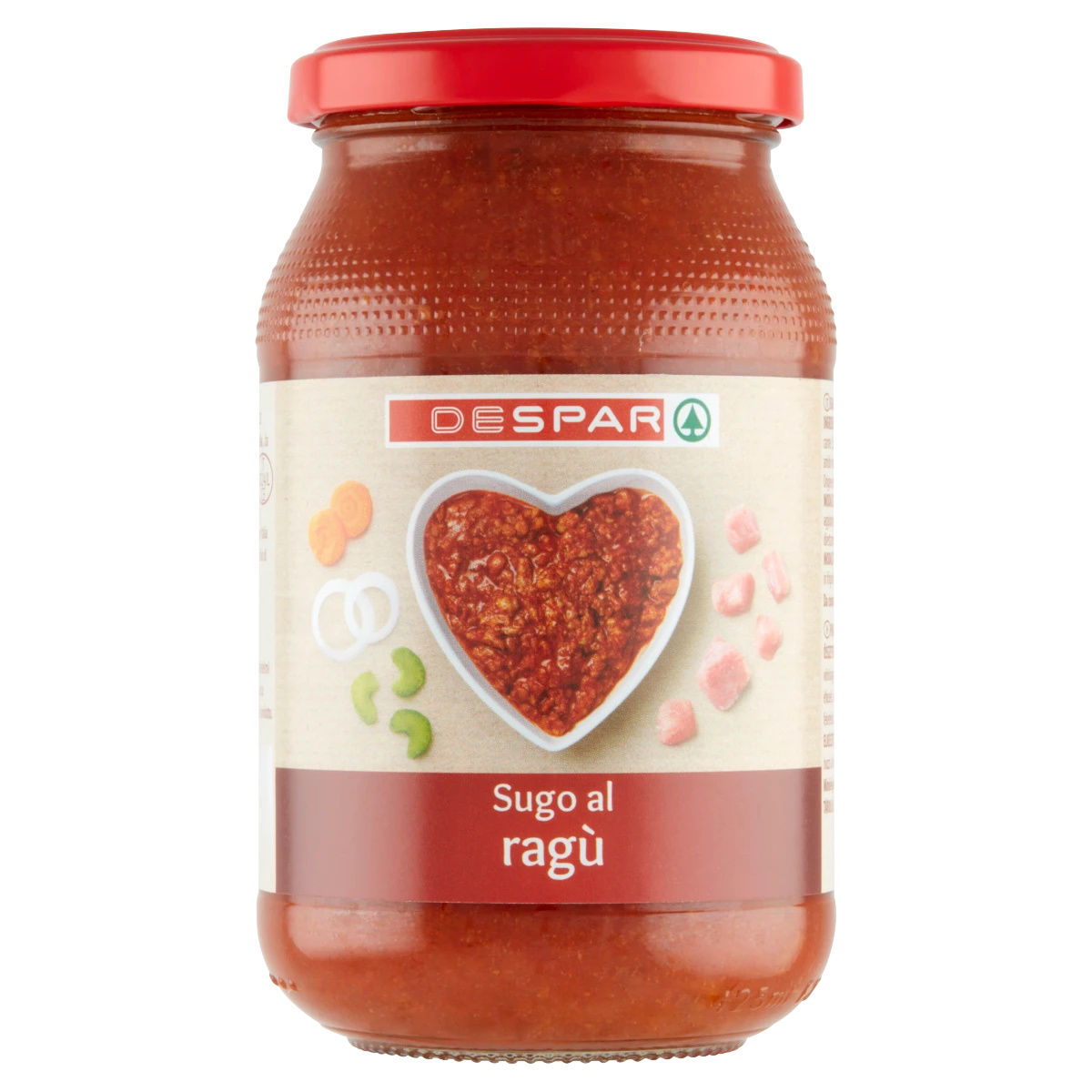 Zúzott paradicsom (61%),Darált marhahús (9,5%),Darált sertéshús (9,5%),Vöröshagyma (7,5%),Sárgarépa (3,5%),Zeller (3%),Sűrített paradicsom (1,8%),Napraforgóolaj,Étkezési só,Módosított kukoricakeményítő,Cukor,Élesztőkivonat,Babér,Természetes zsálya aroma,Feketebors
