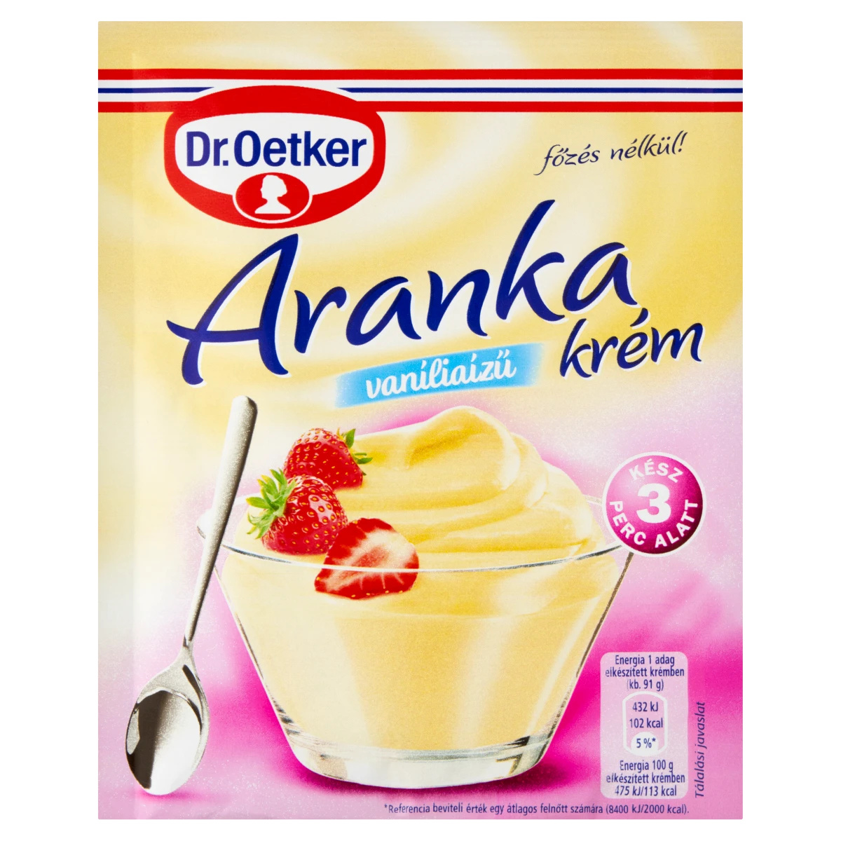 Hozzávalók: 1 tasak Aranka krémpor + 300 ml hideg tej. (4 adag elkészítéséhez elegendő) Elkészítés: 1. A 300 ml hideg tejet egy magas- falú keverőedénybe öntjük. 2. Hozzáadjuk a krémport és konyhai robotgéppel (habverő) először alacsony, majd a legmagasabb fokozaton a krémállag eléréséig, kb. 3 percig keverjük. 3. Az Aranka krémet poharakba vagy tálkákba töltjük és tálalás előtt kb. 1 óráig hűtőszekrényben tároljuk. Receptjavaslat: Rumos-gesztenyés vaníliakrém: Az Aranka krémet készítsük el a leírás szerint, de csak 250 ml tejjel és 50 ml rummal. A kész krémet gesztenyemasszával felváltva rétegezzük desszertes poharakba.