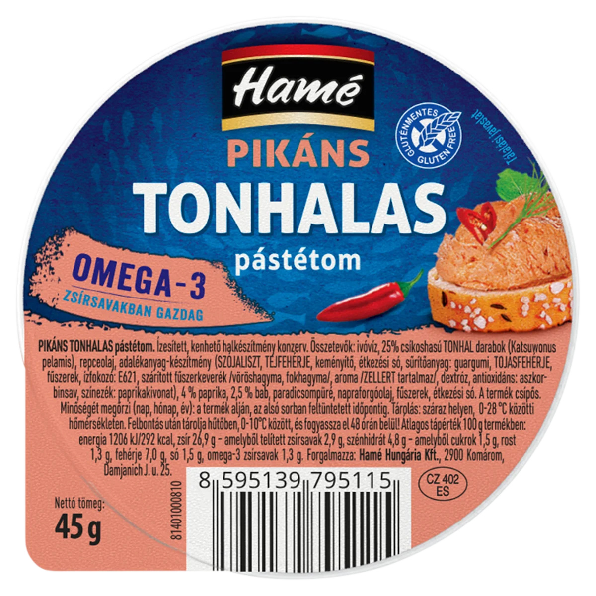 Pikáns tonhalas pástétom. Ízesített, kenhető halkészítmény konzerv.