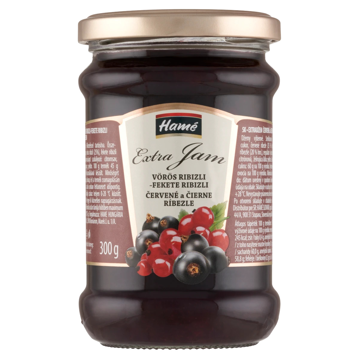 Cukor,Vörös ribizli (25%),Fekete ribizli (20%),Savanyúságot szabályozó: citromsav,Zselésítő anyag: pektin,100 g termék 45 g gyümölcs felhasználásával készültTápanyagok