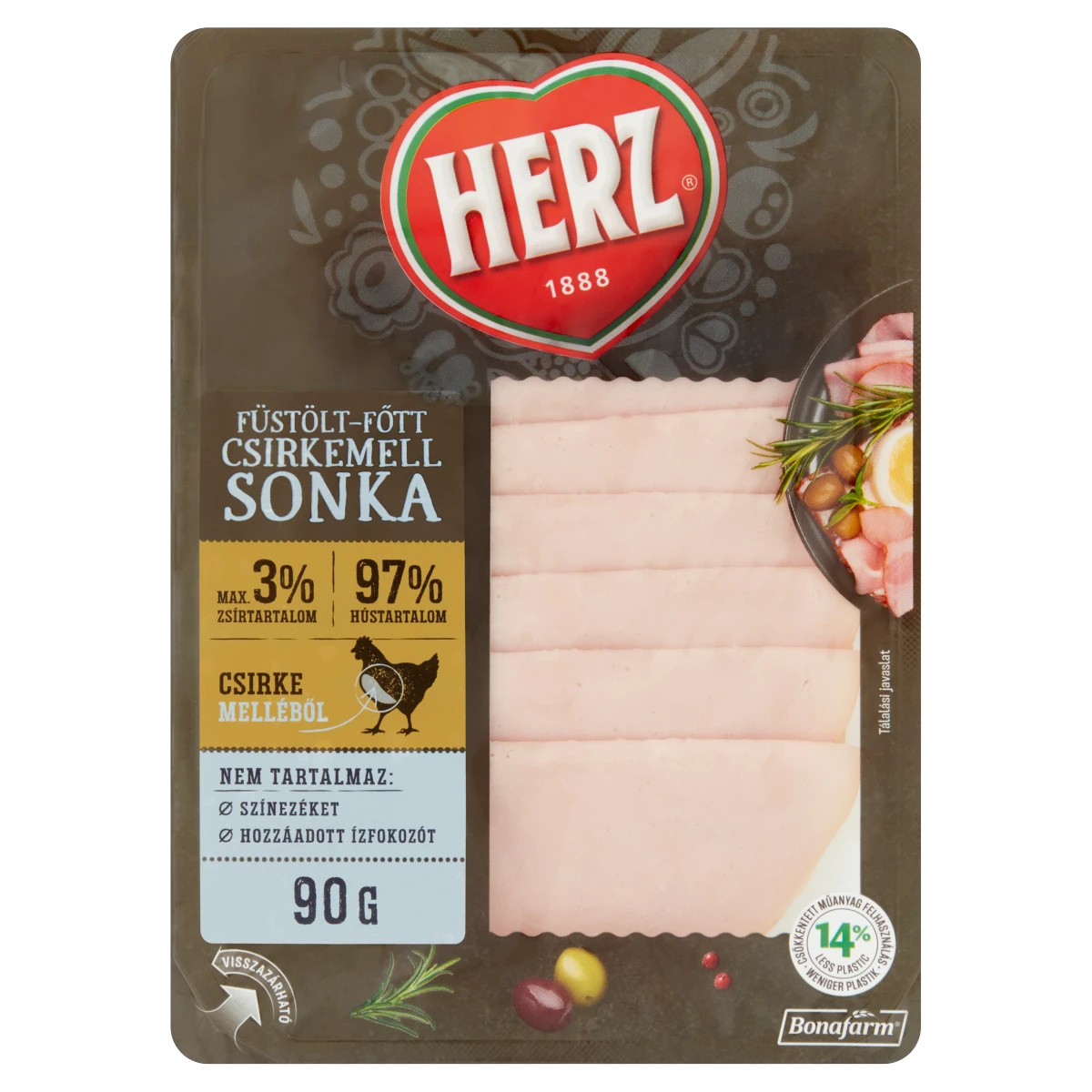 Füstölt-főtt csirkemell sonka, gyorspácolt, darabokból formázott, hőkezelt, szeletelt sonka, védőgázas csomagolásban