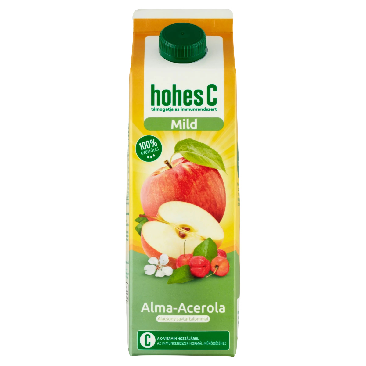 Élj a C-vitamin erejével! Már egy pohár (250 ml) Hohes C Mild Alma-acerola fedezi a felnőttek számára ajánlott napi C-vitamin mennyiséget. A C-vitamin hozzájárul az immunrendszer normál működéséhez a változatos, kiegyensúlyozott táplálkozás és az egészséges életmód mellett. Természetes C-vitamin az immunrendszer és az energiatermelő anyagcsere folyamatok normál működésének támogatásához 1 pohár = 1 napi adag C-vitamin* *A C-vitamin hozzájárul az immunrendszer normál működéséhez és a normál energiatermelő anyagcsere folyamatokhoz a változatos, kiegyensúlyozott táplálkozás és az egészséges életmód mellett. Napi egy pohár Hohes C* Fedezi a napi C-vitamin szükségletet** Támogatja az immunrendszer normál működését. Ideális kiegészítője a kiegyensúlyozott étrendnek és egészséges életmódnak *250 ml **A C-vitamin hozzájárul az immunrendszer normál működéséhez és a normál energiatermelő anyagcsere-folyamatokhoz a változatos kiegyensúlyozott táplálkozás és az egészséges életmód mellett. Az összes ismert gyümölcs és zöldségféle közül az acerola rendelkezik a legmagasabb C-vitamin tartalommal. Az örökzöld acerola bokor Közép- és Dél-Amerikában őshonos. Csonthéjas gyümölcse 1-3 cm nagyságú, színe a narancssárgától a vörösig terjedhet, puha gyümölcshúsát vékony héj fedi.
