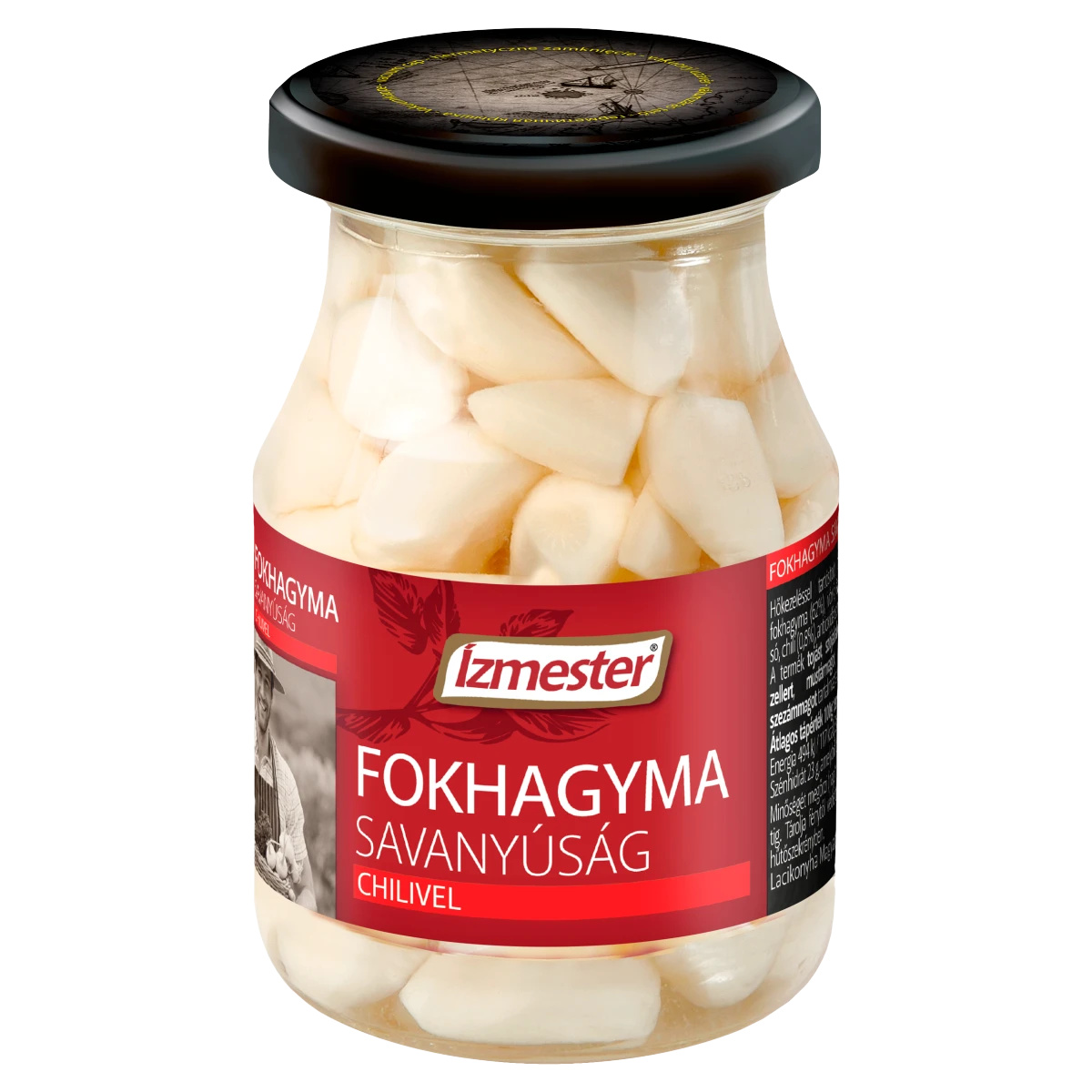 Az Ízmester chilis fokhagymás savanyúság roppanós állagú, enyhén savanykás egész fokhagymagerezdekből készül, amelyeket pikáns chilivel fűszerezett páclé tesz igazán izgalmassá. Lágyabb, mint a nyers fokhagyma, mégis karakteres ízvilágot kínál. Kiváló kiegészítő hidegtálakhoz, szendvicsekhez vagy akár magában is fogyasztható ízes snackként.