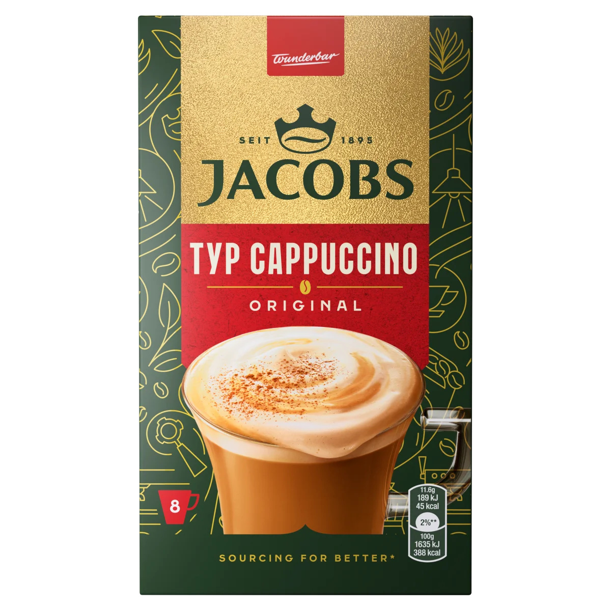 A Jacobs Cappuccino krémes habjával és édességével nagyszerű társ a különleges pillanatokhoz. Kiszerelés: 8 x 14,4g.Elkészítés: öntse egy tasak tartalmát egy csészébe. Adjon hozzá 150 ml forró, de nem forrásban lévő vizet és keverje jól össze.