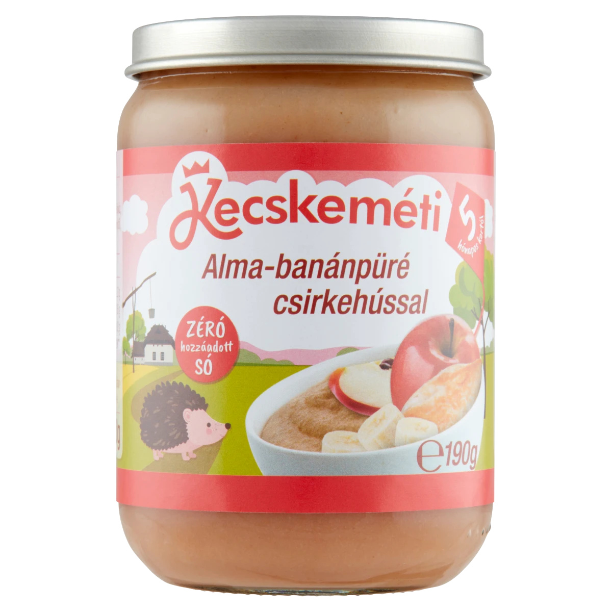 Alma-banánpüré csirkehússal. Bébiétel 5 hónapos kortól. Hőkezeléssel tartósított.
