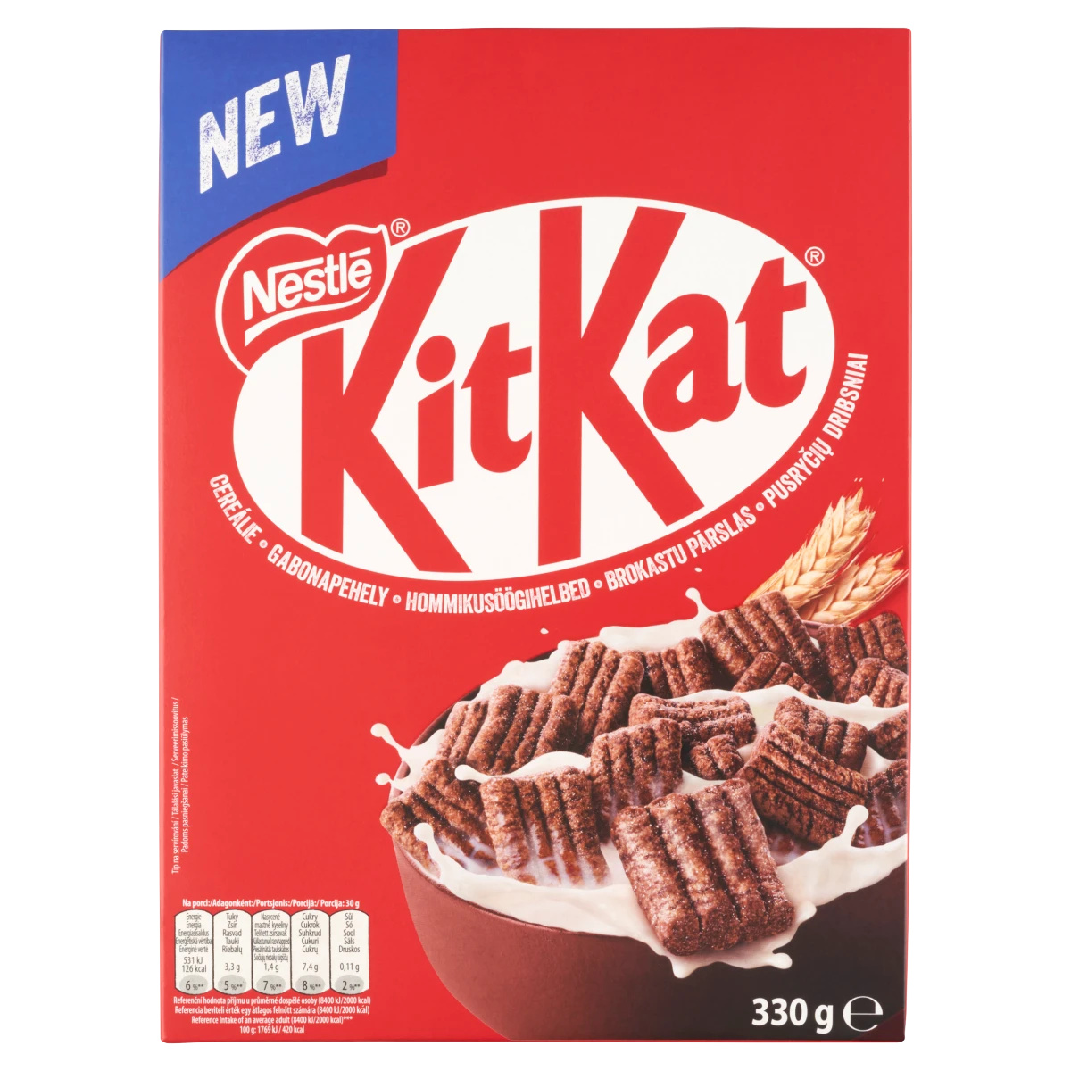 Teljes kiőrlésű búzaliszt 31,4%,Kukoricadara 21,7%,Cukor,Dextróz,Napraforgóolaj,Búzaliszt 5,8%,Kakaópor* 5,4%,Glükózszirup,Kukoricakeményítő,Sovány tejpor 1,9%,Kalcium-karbonát (kalcium),Árpamaláta-kivonat,Zsírszegény kakaópor* 0,5%,Természetes aromák,Kakaóvaj*,Étkezési só,Kakaómassza*,Emulgeálószer (lecitinek),Tejsavópor,Tejzsír,Antioxidáns (tokoferolban gazdag kivonat),Elemi vas (vas),Nikotinamid (Niacin),Kalcium-D-pantotenát (Pantoténsav),Piridoxin-hidroklorid (B6-vitamin),Riboflavin (B2-vitamin),Pteroil-monoglutaminsav (Folsav),*Rainforest Alliance tanúsított. További információ a ra.org oldalon,100 g gabonapehely előállításához 31,4 g teljes értékű gabonát használtunk felTápanyagok