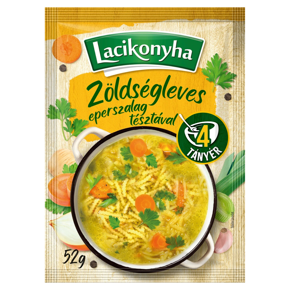 Tészta 57,7% (búzaliszt, tojás, ivóvíz),Étkezési só,Maltodextrin,Zöldségek (8,7%): paszternák, sárgarépa, petrezselyemlevél, fokhagyma, vöröshagyma, póréhagyma,Ízfokozók: nátrium-glutamát, dinátrium-5\'-ribonukleotidok,Hidrolizált növényi fehérje,Tyúkzsír,Kurkuma,Fekete bors (0,1%),Aroma (zellert tartalmaz),Színezék: ammóniás karamellTápanyagok