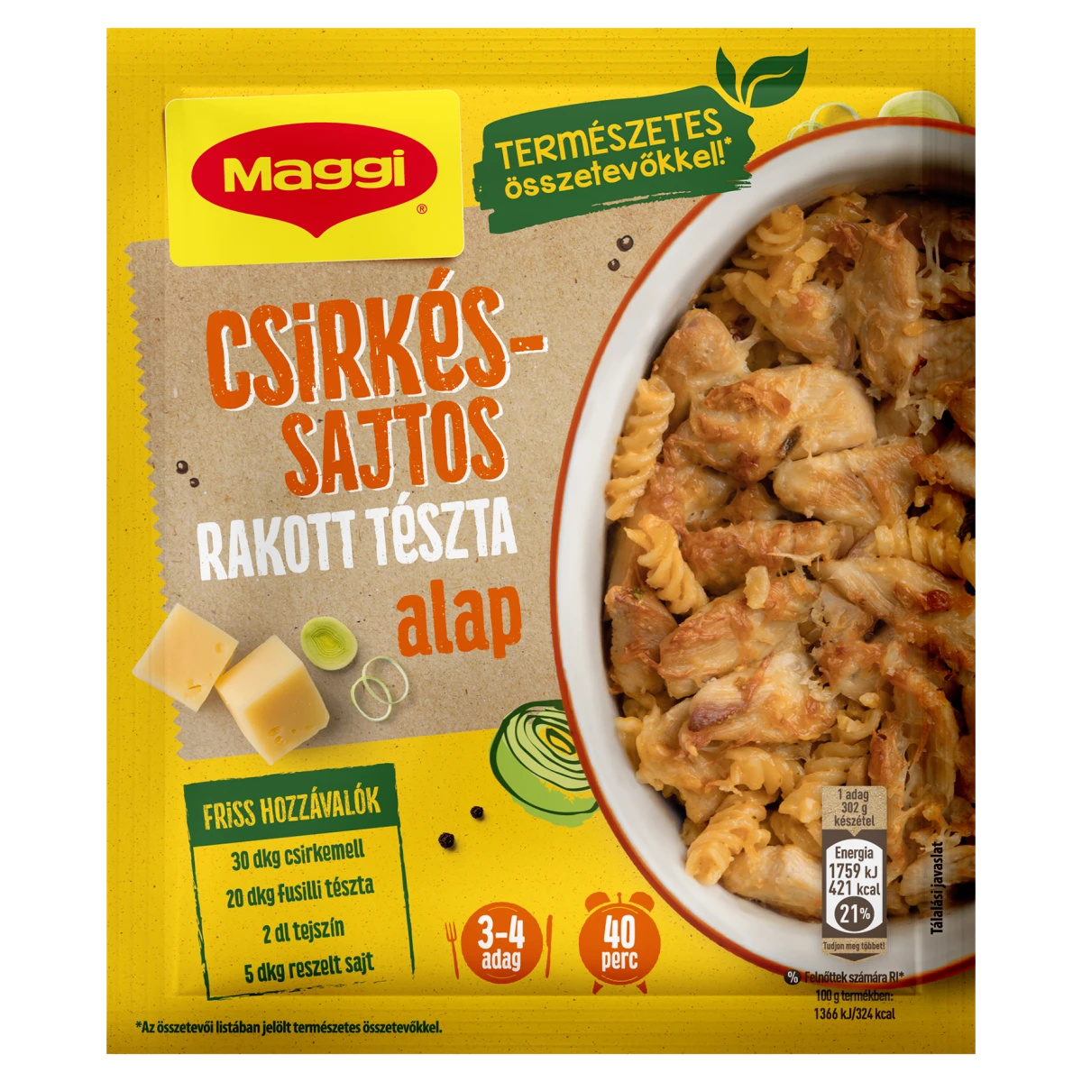 A rohanós hétköznapok egyik kedvence lehet a megújult Maggi Csirkés-sajtos rakott tészta alap, mellyel tartalmas egytálételt készíthetünk a családnak. Előnye, hogy a tésztát nem szükséges előfőzni, nyersen tehetjük a tepsibe, majd ráöntjük a csirkés-tejszínes szószt, végül pedig megszórjuk sajttal. Mindössze 20-25 perc alatt elkészül a sütőben. A teteje ropogós lesz, alatta viszont egy ízletes szaftos tésztaételt kapunk. A tasakban a szárított fűszerek és zöldségek biztosítják a megfelelő ízvilágot. Minőségi alapanyagokból, az összetevő listában jelölt természetes összetevőkkel. A termék természetes színezéket tartalmaz és hozzáadott aroma nélkül készül. Minden Maggi alap szárított összetevőkből készül, ezzel biztosítjuk a termékek eltarthatóságát, és ennek köszönhetően nincs szükség tartósítószer hozzáadására sem.