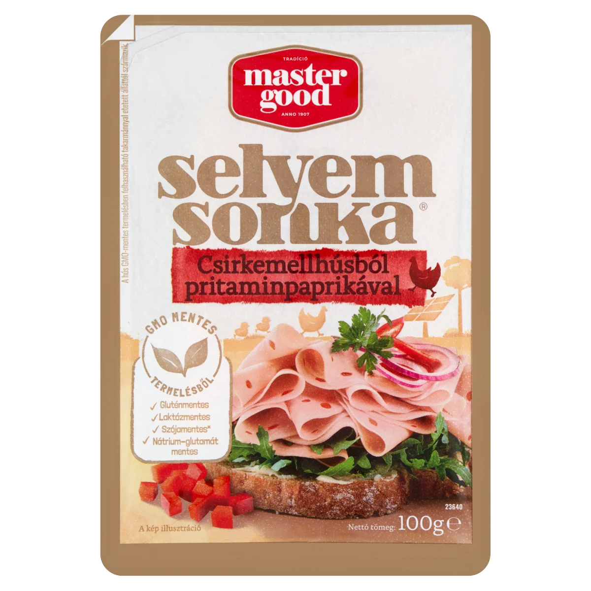 Formázott, hőkezelt csirkemell sonka aprított pritaminpaprikával, szeletelt, védőgázas csomagolásban.