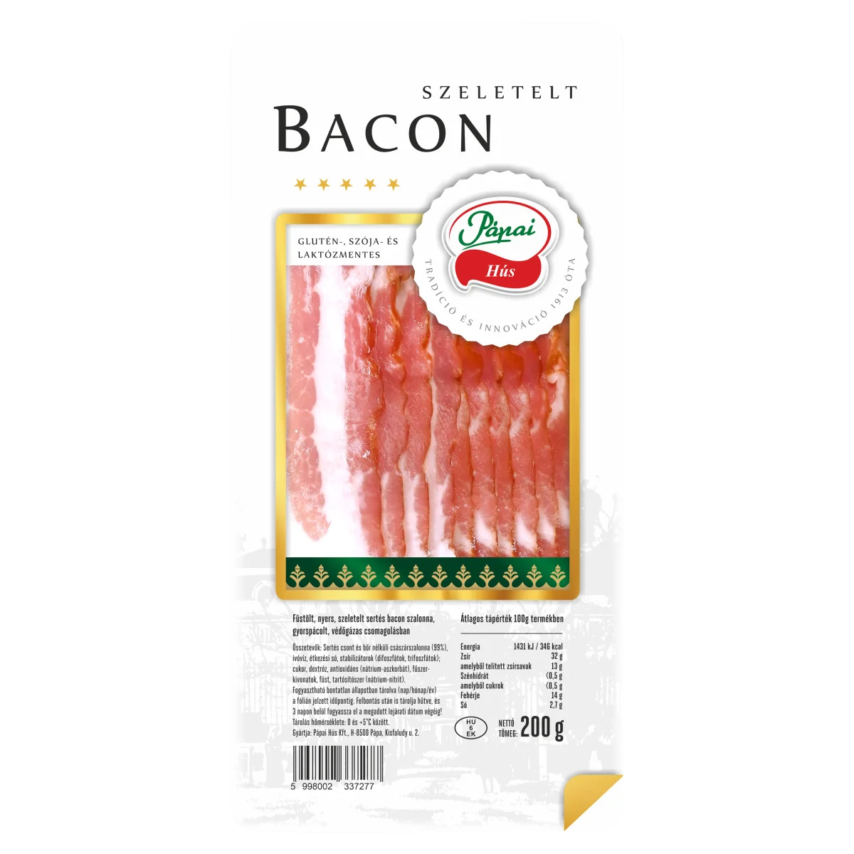Füstölt szeletelt sertés bacon szalonna nyers, gyorspácolt, védőgázas csomagolásban.