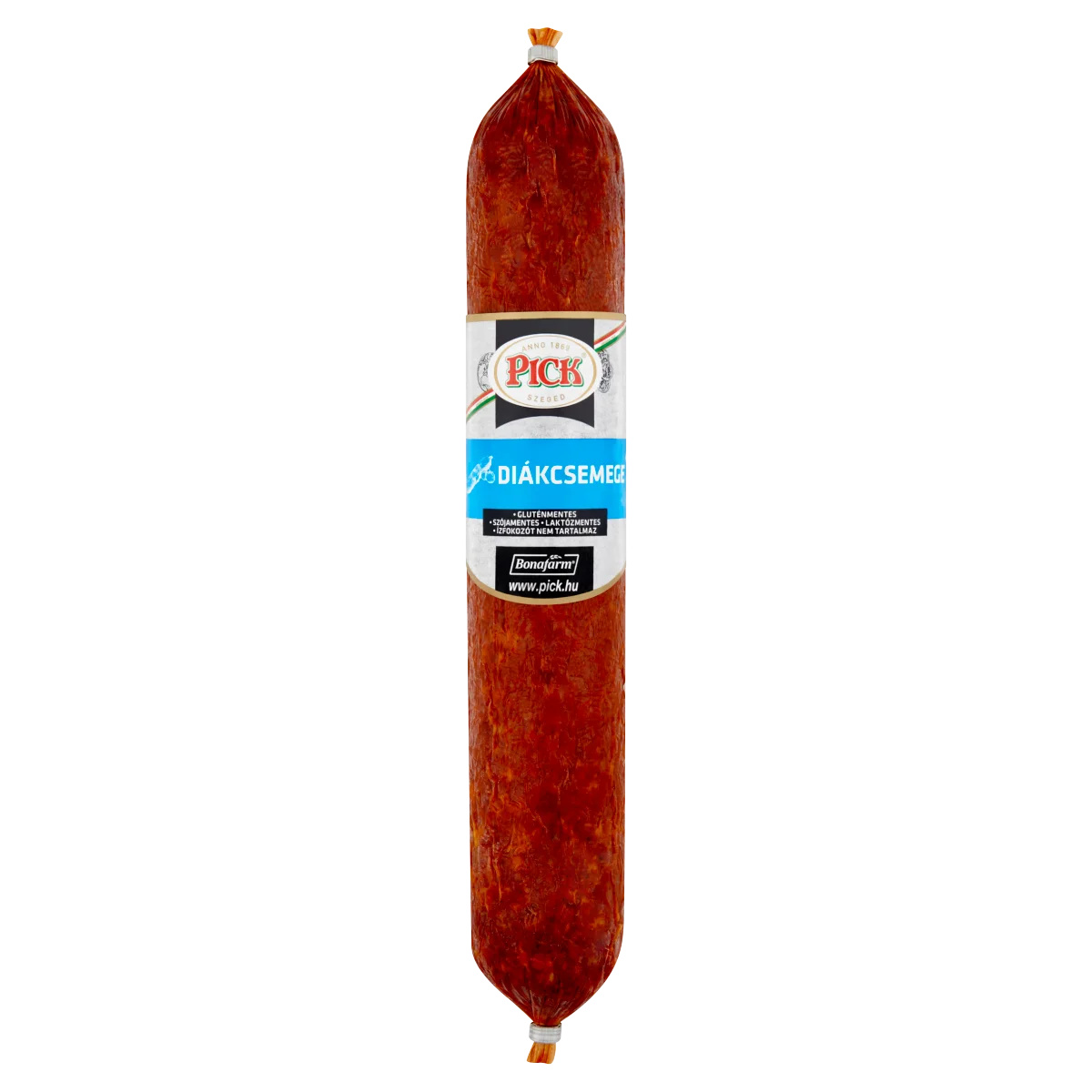 Diákcsemege. Füstölt, érlelés-szabályozóval készült paprikás kolbász, nem ehető bélben, védőgázas csomagolásban