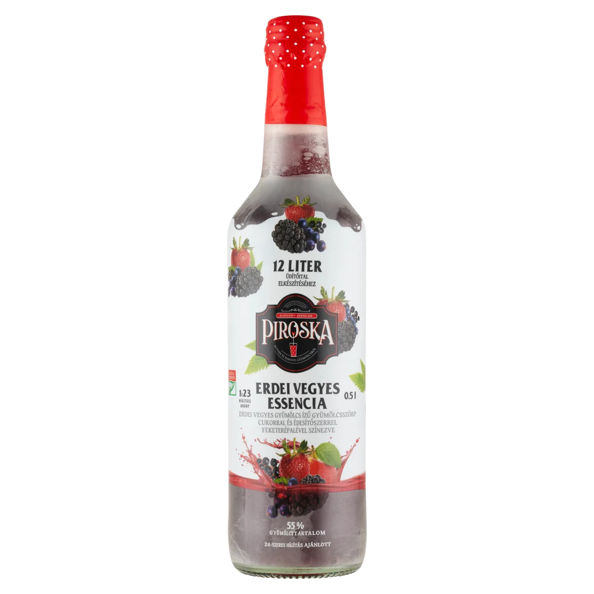 Erdei vegyes gyümölcs ízű gyümölcsszörp cukorral és édesítőszerrel feketerépalével színezve 55% gyümölcstartalommal