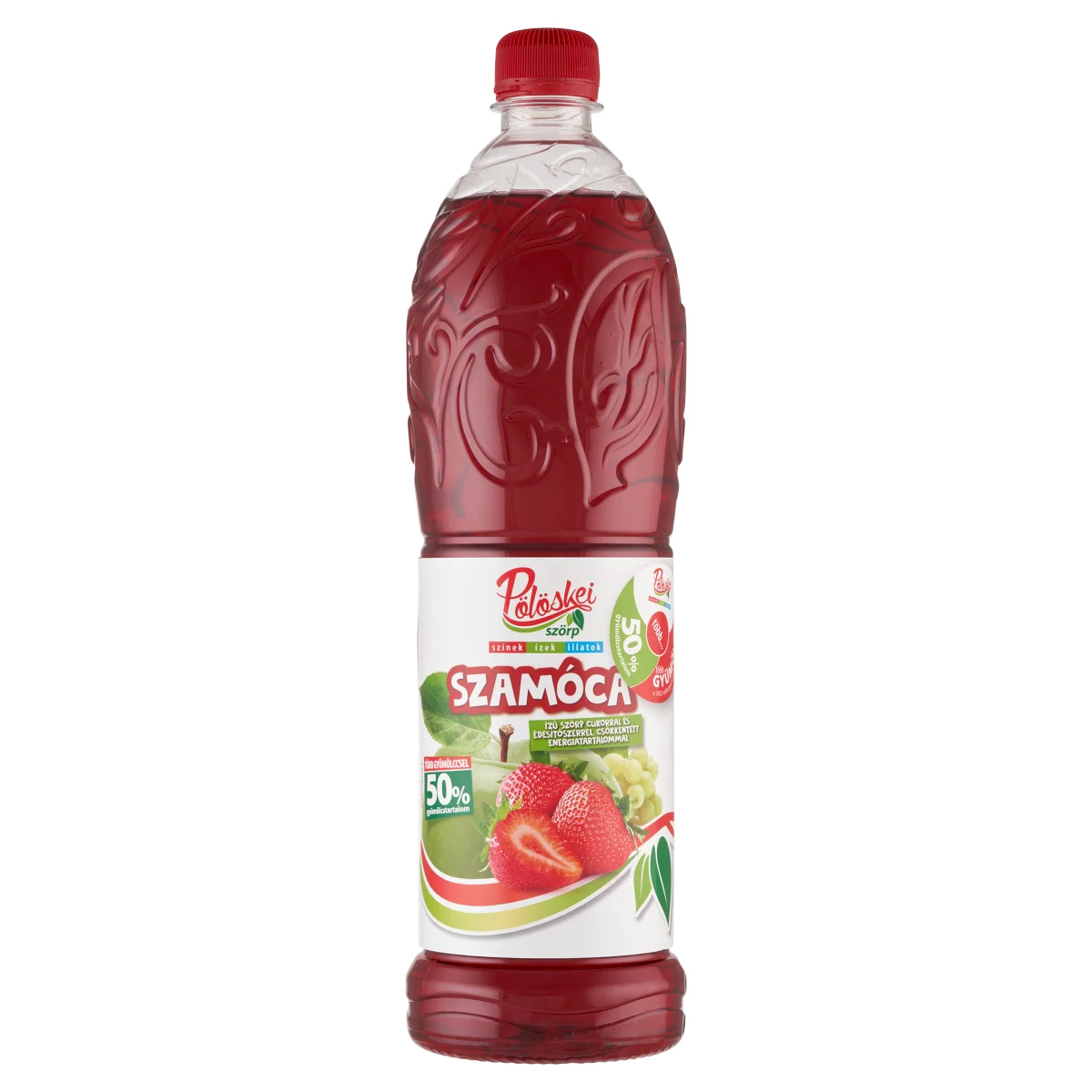 Szamóca ízű szörp cukorral és édesítőszerrel, csökkentett energiatartalommal.