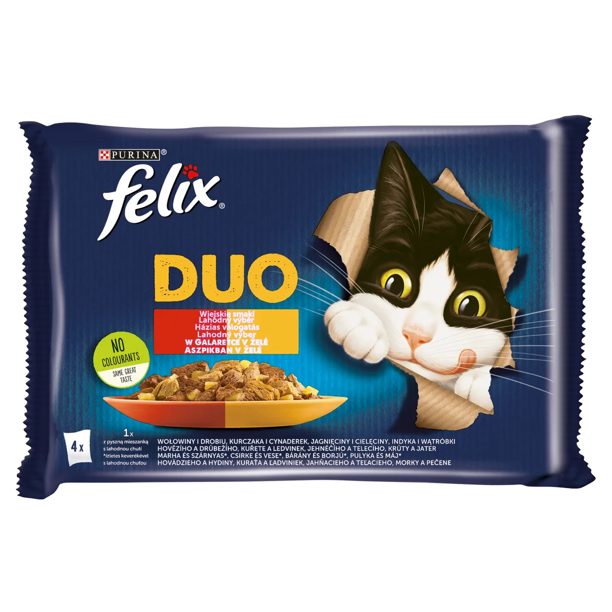 Teljes értékű állateledel felnőtt macskák számára. Ivartalanított macskáknak is adható A Felix® Duo ellenállhatatlan eledelek választékát kínálja olyan étvágygerjesztő látvánnyal, illattal és ízzel, mintha te magad készítetted volna! Minden receptúra minőségi összetevőkkel készül és kétféle, finom ízű, puha falatkákat tartalmaz aszpikban, így cicád egyszerre élvezheti két kedvenc ízét egyetlen ízletes eledelben! A Felix® Duo receptúrák Omega-6 zsírsavak forrásai, és megfelelő arányban tartalmaznak vitaminokat, hogy 100%-osan kielégítsék cicád napi tápanyagszükségletét, amennyiben követed a csomagoláson lévő etetési útmutatót. Ez még nem minden! A Felix® Duo eledelek széles ízválasztékban és zamatos aszpikban kaphatók, hogy kielégítsék cicád változatos igényeit. Valóban kétszer olyan ízletesek! Felix - Egyszerűen ellenállhatatlan!
