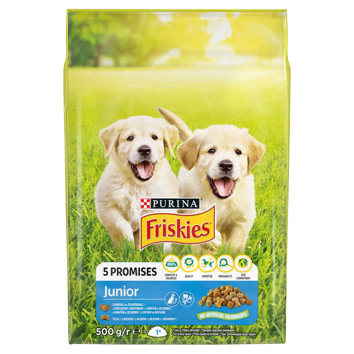 A Friskies® 5 ígérete. Attól a naptól kezdve, hogy kutyádat hazaviszed, el is kötelezed magad. Megígéred, hogy törődni fogsz vele, megfelelően eteted és segítesz neki, hogy boldog, egészséges, életerővel teli életet élhessen és minden nap boldogsággal tölthesse meg otthonodat. A Friskies több évtizedes tapasztalatára és szakértelmére támaszkodva táplálja a boldog és egészséges kutyák sokadik generációját ízletes és minőségi táplálékkal minden nap. Erre nemcsak büszkék vagyunk, hanem hatalmas felelősségként is tekintünk. Hozzád hasonlóan a Friskies-nél mi is mindent megteszünk, hogy álljuk a szavunkat. A kutyádnak és neked egyaránt. 5 ígéretet teszünk, hiszen törődünk veletek: - Táplálás: 100%-ban teljes értékű, kiegyensúlyozott és ízletes eledel állati és növényi alapú (pl. gabonafélékből származó) fehérjék keverékével - Minőség: termelési folyamatunk során több száz ellenőrzést végzünk minden nap - Szakértelem: a Purina táplálkozástudományi szakértői fejlesztésének eredménye - Nyomon követhetőség: magas minőségű összetevőkkel készült, amelyeket gondosan válogattunk ki ismert és megbízható forrásokból - 2025-ös vállalás: vállaljuk, hogy 2025-re 100%-ban újrahasznosíthatóvá, illetve újra felhasználhatóvá tesszük a csomagolást Receptúráink ezenfelül nem tartalmaznak mesterséges színezékeket, ízesítőanyagokat és tartósítószereket. A Purina® Friskies® Junior ízletes receptúrája csirkével és zöldségekkel, valamint teljes kiőrlésű gabonával, B-vitaminokkal, Omega-3 és -6 zsírsavakkal, és tejjel a csontformájú tápszemekben. A kölyökkutyáknak lényegesen több energiára van szükségük, mint a felnőtt kutyáknak, hogy nagyra nőjenek és minél játékosabbak legyenek. A Friskies® Junior 100%-ban kiegyensúlyozott és tápláló eledel extra fehérjével és a kölyökkutyák számára szükséges vitaminokkal.