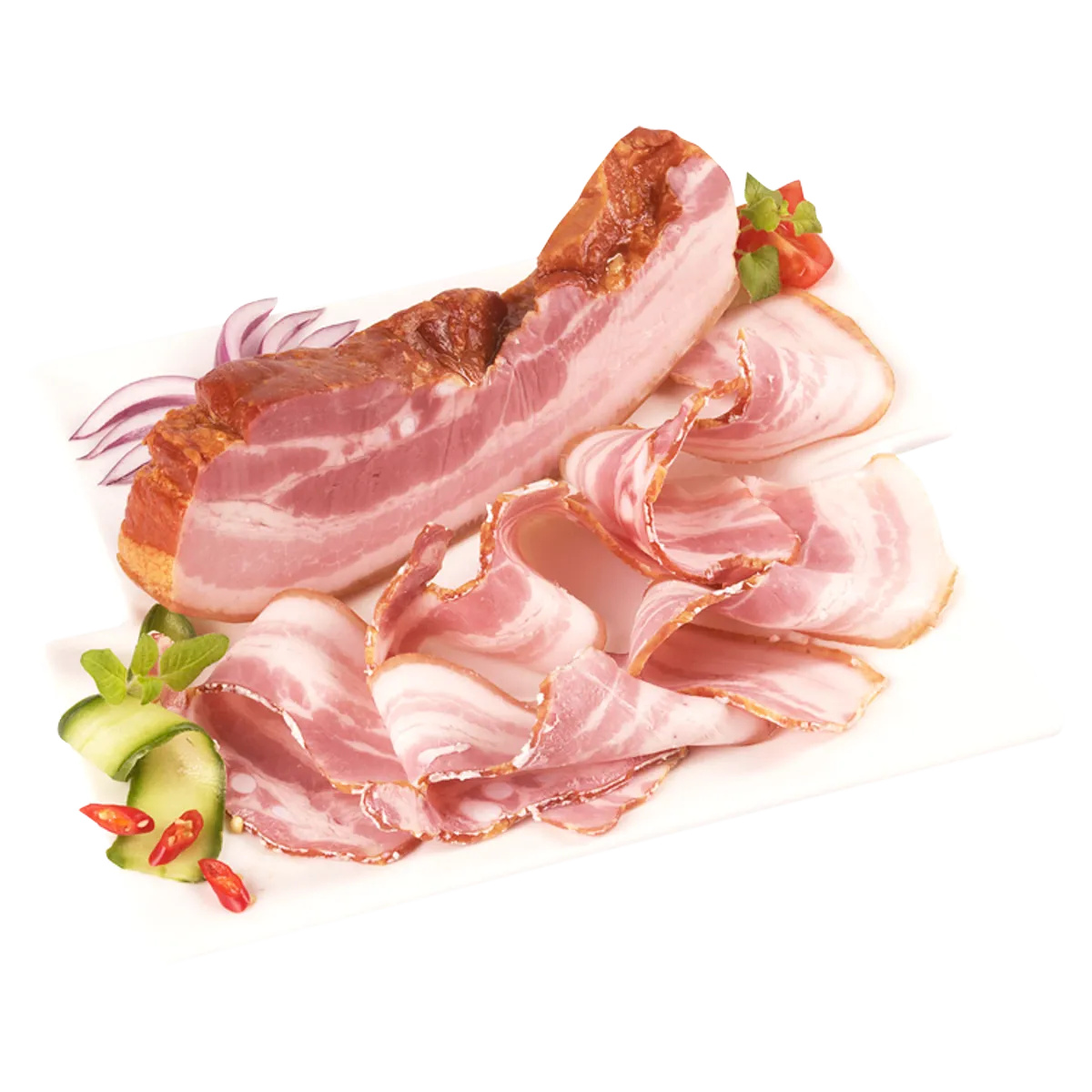 Füstölt, főtt, darabolt sertés császárszalonna gyorspácolt, vákuumcsomagolt