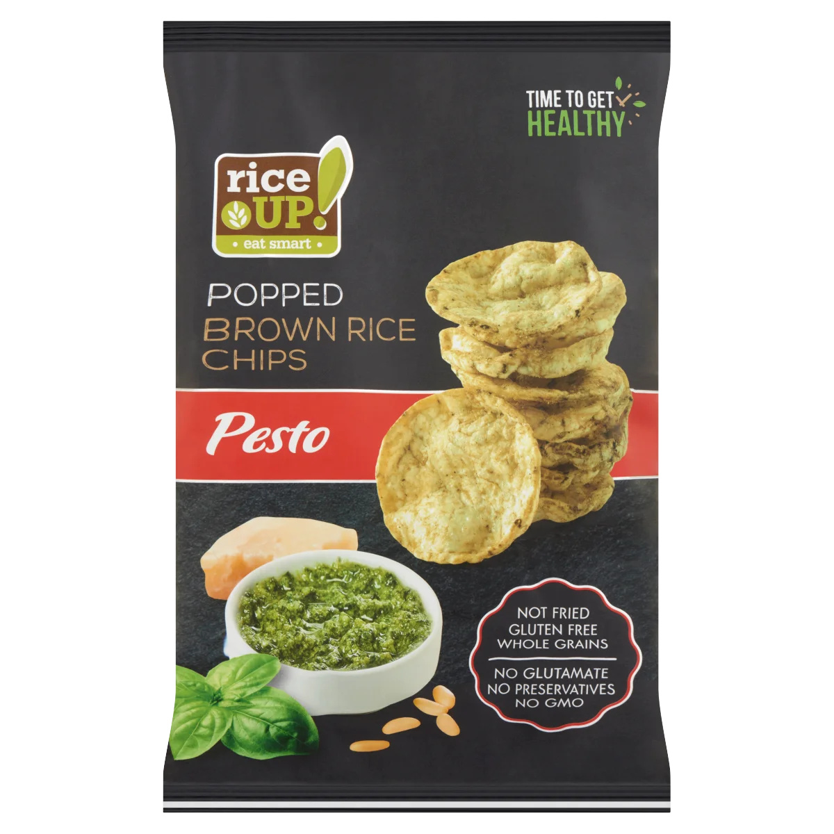 Teljes kiőrlésű barna rizs chips pesto ízesítéssel.