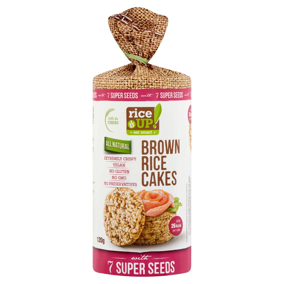 Puffasztott teljes kiőrlésű barna rizs szelet szupermagvakkal.