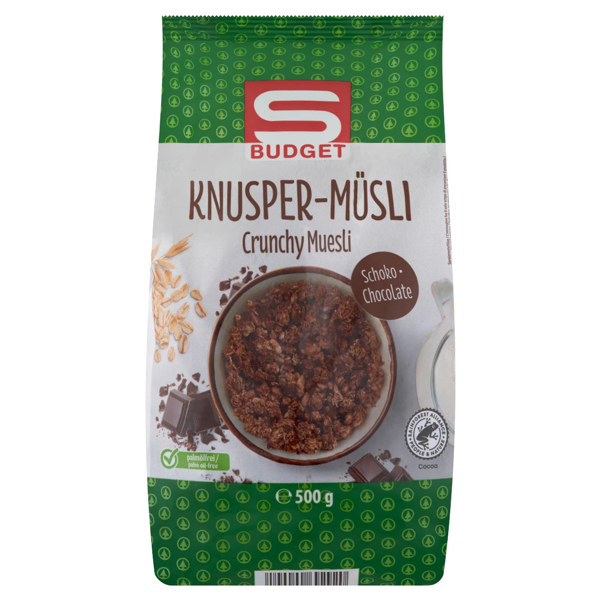 Ropogós müzli teljes kiőrlésű zabpehellyel 52% extrudált gabona készítménnyel 5%, teljes kiőrlésű búzapehellyel 5% és étcsokoládéval 4%