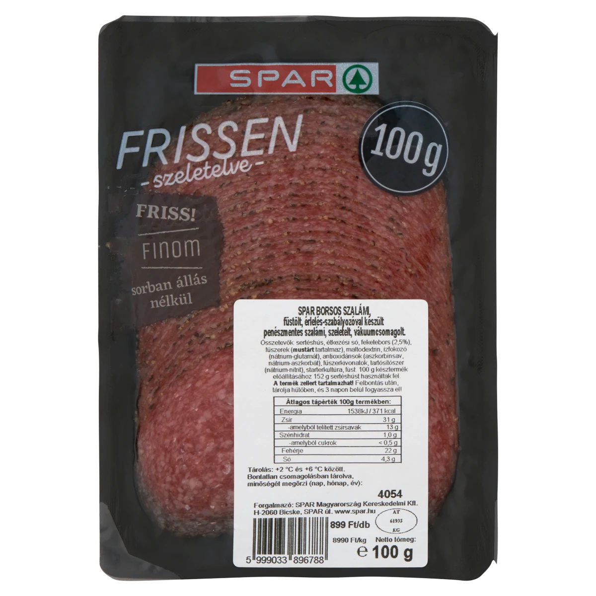 Borsos szalámi, füstölt, érlelės-szabályozóval készült penészmentes szalámi, szeletelt, vákuumcsomagolt.