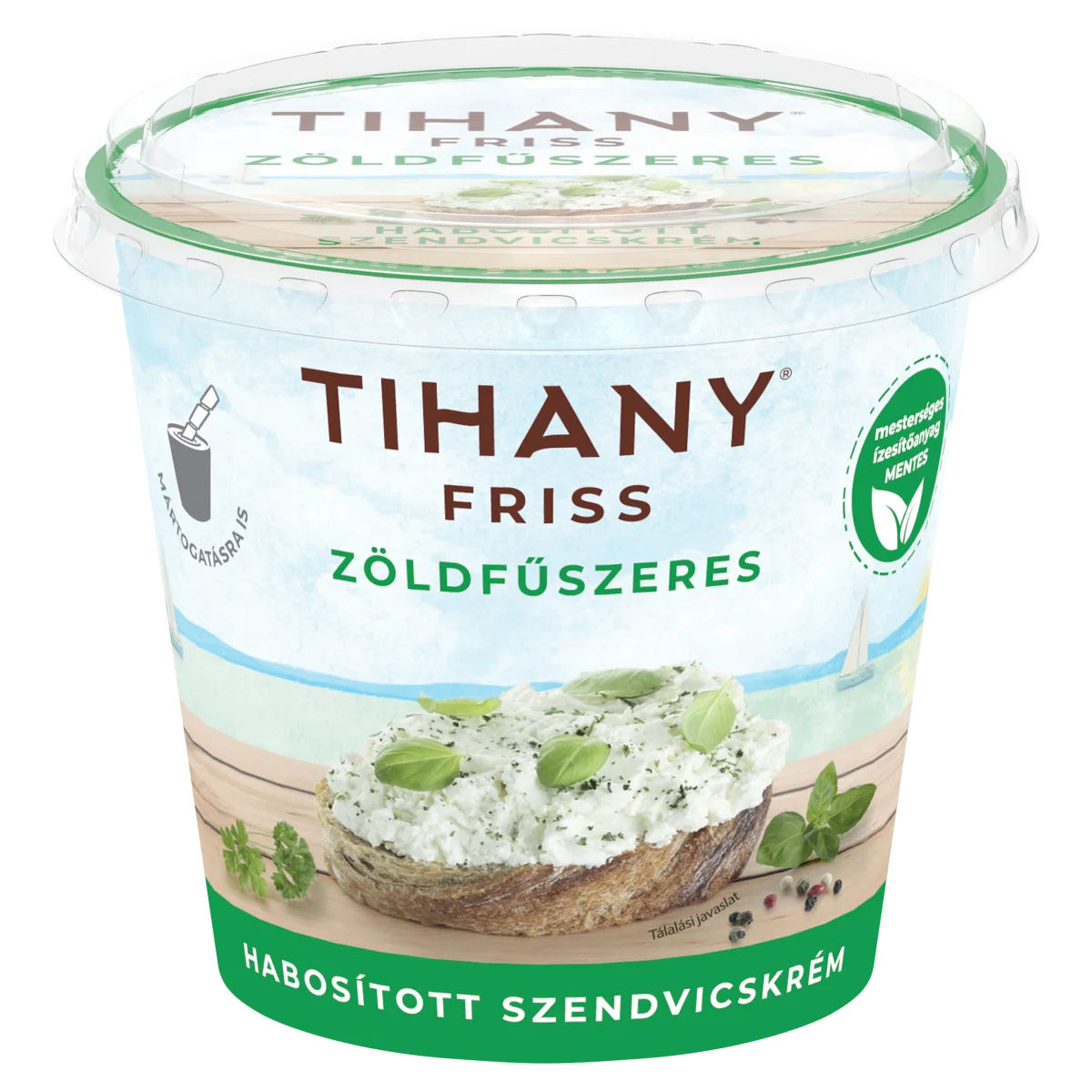 Utóhőkezelt, habosított, zöldfűszeres szendvicskrém sajtból.