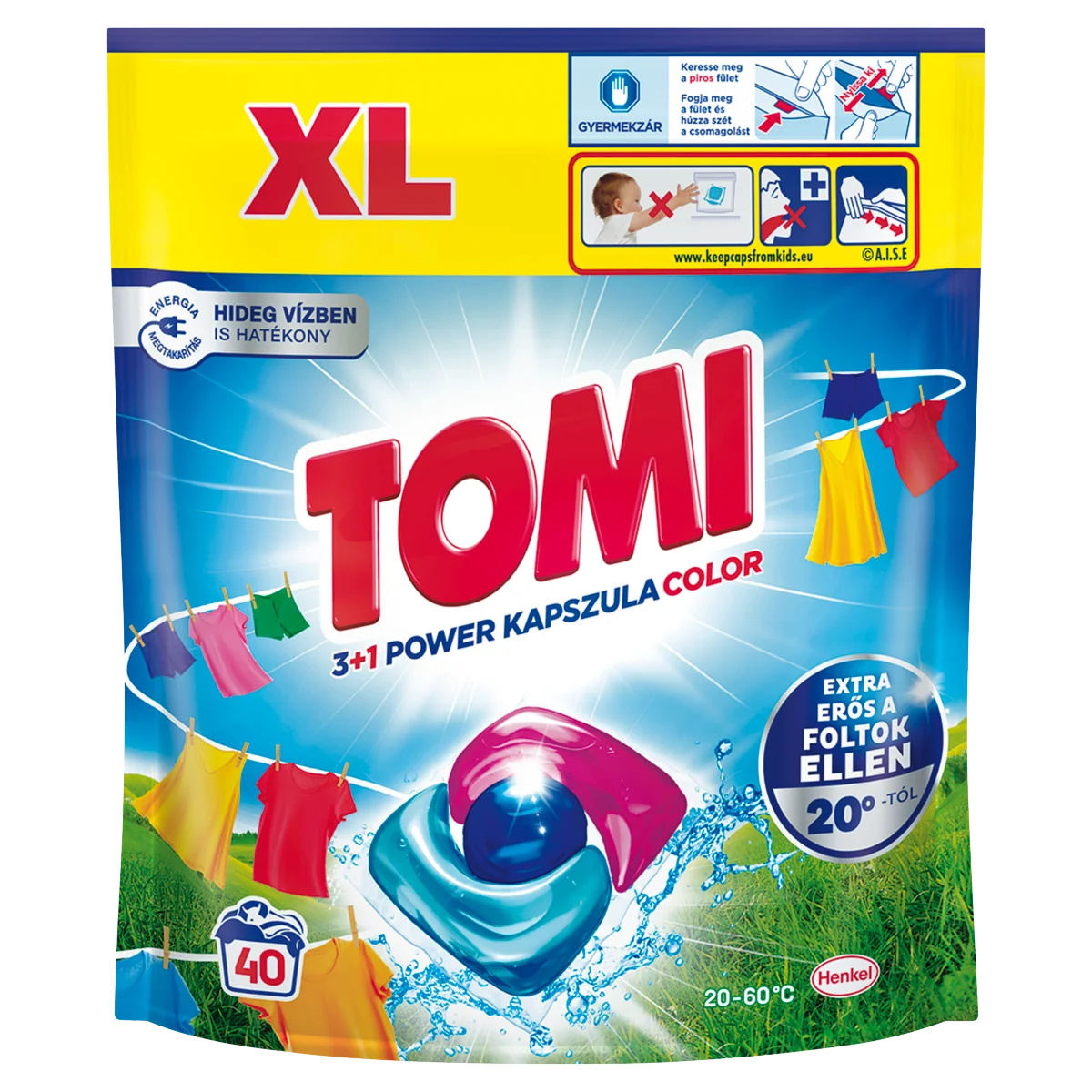 Tomi 3 az 1-ben Power kapszula Color színes ruhákhoz. A Tomi Color 3 az 1-ben Power kapszulák extra erősen lépnek fel a színes ruhák foltjai ellen, akár 20 fokos mosáson is. Az új erőteljes formulának köszönhetően a foltok eltávolítása mellett a Tomi nagy mennyiségű szennyezett ruha számára biztosítja a ragyogó tisztaságot és frissességet már alacsony hőfokon is, energiát megtakarítva. - Tiszta, ragyogó és friss ruhák, - Extra erős a foltok ellen. - Hidegvizes mosás esetén is hatékony