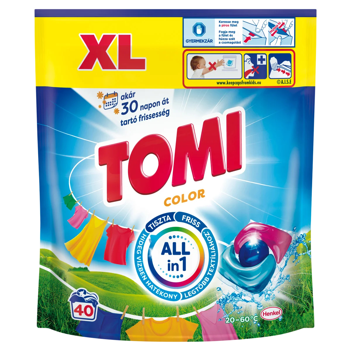 Tomi Color kapszula - színes ruhákhoz A Tomi Color kapszula extra erővel veszi fel a harcot a színes ruhák legmakacsabb foltjaival, akár hideg vízben is. Innovatív formulája nemcsak hatékonyan eltávolítja a foltokat, hanem ragyogó tisztaságot és hosszan tartó frissességet biztosít. Az előre adagolt kapszulák egyszerűvé és kényelmessé teszik a mosást, miközben energiát takarítanak meg hideg vizes mosási programok esetén. A Tomi All in 1 - Color kapszula, egyetlen termékben ötvözi mindazt, amire szükséged lehet a tökéletes mosáshoz: - Tisztaság: Hatékonyan eltávolítja a legmakacsabb foltokat. - Friss illat: Akár 30 napig tartó frissesség. - Sokoldalúság: Alkalmas a legtöbb textíliához* - Energiamegtakarítás: Hideg vízben is hatékony, így csökkenti az energiafelhasználást. *Kivéve selyem és gyapjú