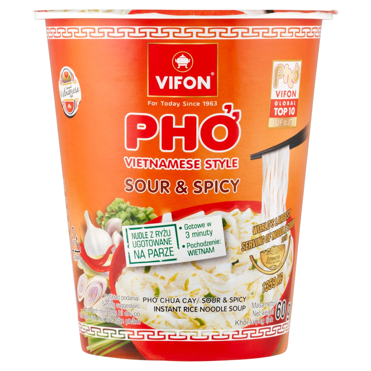 Rizstészta (79,7%): rizs (90%), módosított keményítő, cukor, só, ízfokozó: nátrium-glutamát, stabilizátor: guargumi,Leves alap (15%): só, cukor, ízfokozó: nátrium-glutamát, dinátrium-guanilát, dinátrium-inozinát, aroma (rákfélék, szójabab), pálmaolaj, csomósodást gátló anyag: E 551, savanyúságot szabályozó anyag: E 330, élesztő kivonat por, maltodextrin, chili paprika (0,4%), színezék: karamell, karotinok,Chili mártás (5%): víz, chili paprika, cukor, fokhagyma (5%), só, paradicsom krém 4%, módosított keményítő, savanyúságot szabályozó anyag: ecetsav, citromsav, tartósítószer: kálium-szorbát,Fűszerkeverék chilivel (2,5%): mogyoróhagyma (59%), citromfű (20%), pálmaolaj, chili paprika (2%), hal mártás (szardella (65%), só víz),Szárított fűszerek (0,8%): zöldhagyma (84%), chili paprika (16%),Szárított zöldségek (0,8%): zöldhagyma, piros chili paprikaTápanyagok