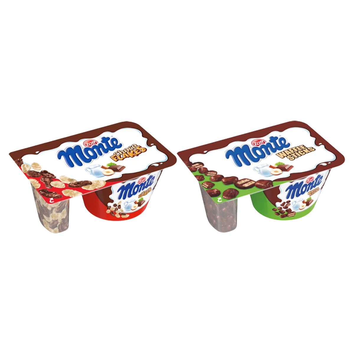 Csokoládés-mogyorós tejdesszert csokoládéval bevont kukoricapehellyel. Ultramagas hőmérsékleten hőkezelt, homogénezett termék. Csokoládés-mogyorós tejdesszert csokoládés ostyával. Ultramagas hőmérsékleten hőkezelt, homogénezett termék.